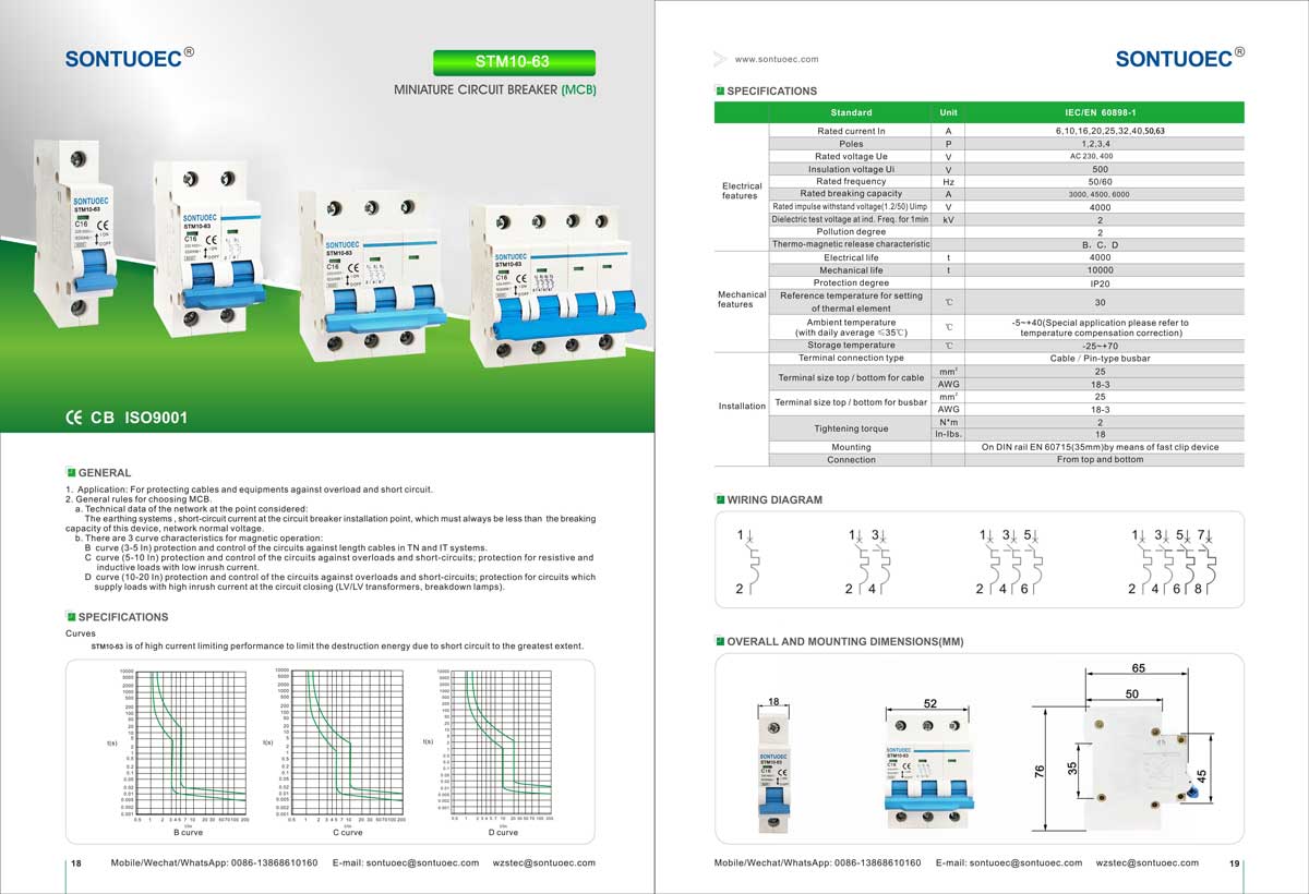 SONTUOEC je eden od kitajskih dobaviteljev/proizvajalcev, specializiranih za proizvodnjo različnih majhnih električnih naprav. Miniaturni odklopnik serije STM10-63 ima značilnosti napredne strukture, zanesljivo delovanje, visoko prekinitveno zmogljivost, eleganten videz, njegova lupina in deli pa so izdelani iz materiala, odpornega na udarce, močne lastnosti, ki zavirajo gorenje. Primeren je za napajalni sistem s frekvenco 50 ali 60, Ue 400V in manj, Ui 63A in manj. Skladen je s standardoma IEC60898.1 in GB10963.1